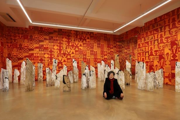 | ▲ This photo, provided by Hakgojae Gallery, shows painter Yun Suk-nam posing in front of her 2021 installation work "Red Room." (PHOTO NOT FOR SALE)(Yonhap) |