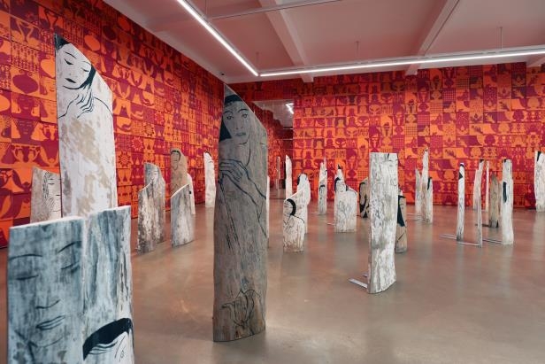 In front of the colored walls are 50 white wooden sculptures that are abstract portraits of the women activists. While the jagged edges symbolize the harsh reality that they went through, according to Yun, their facial expressions are peaceful, like totem poles in front of villages. The room itself thus becomes a memorial space for the unsung heroines.