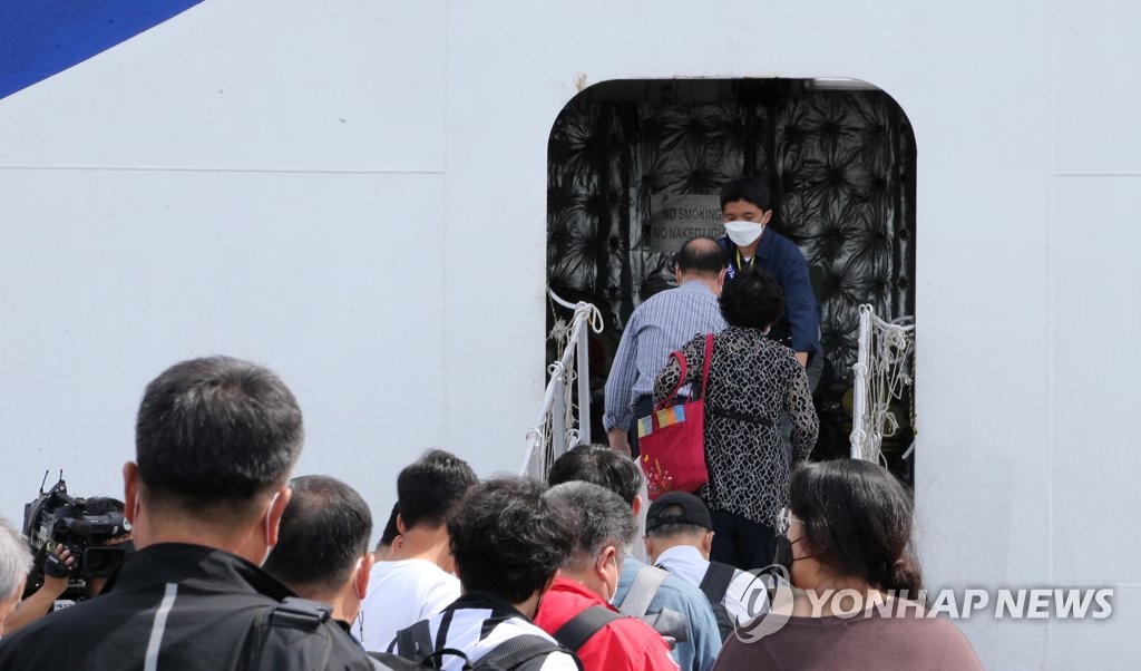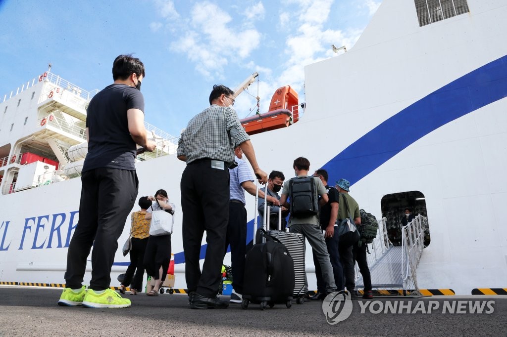 | ▲ 대형 카페리선 타는 여행객 (포항=연합뉴스) 손대성 기자 = 16일 경북 포항 영일만항 국제여객부두에서 여행객들이 울릉크루즈가 운항하는 대형 카페리선인 '뉴 씨다오 펄'호에 타고 있다. 이 배는 이날 처음으로 운항을 시작해 포항 영일만항과 울릉 사동항을 정기적으로 오간다. 2021.9.16 sds123@yna.co.kr |