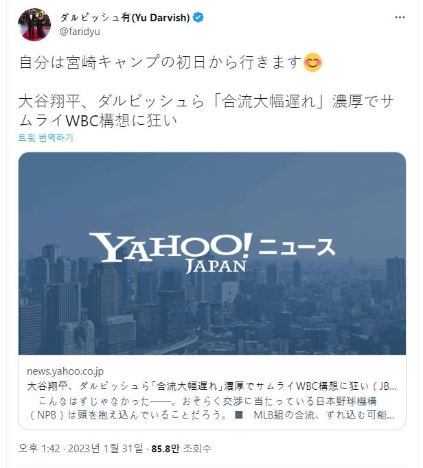 닛칸스포츠 등 일본 언론은 다르빗슈의 사회관계망서비스(SNS) 계정을 인용해 그가 2월 17일부터 일본 미야자키현에서 열리는 일본 대표팀의 훈련에 참가한다고 31일 인터넷판 기사에서 보도했다.