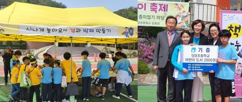 | ▲ 임당초교에서 열린 종이접기 축제와 도서 기증 종이문화재단이 28일 강원도 양구군 임당초등학교에서 개최한 '발그미 어린이 축제 K-종이접기 한마당'에서 종이접기 체험을 하는 학생들(사진 좌측). 이날 해외동포책보내기운동협의회는 임당초 도서관에 2천500권의 도서를 기증했다(우측). [종이문화재단 제공] |