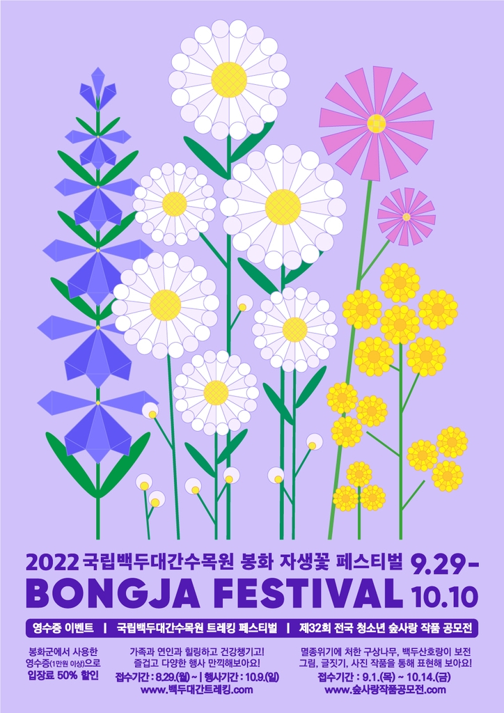 축제 기간인 다음 달 9일에는 봉화와 수목원 명품 숲길을 체험하는 트레킹 페스티벌도 펼쳐진다.