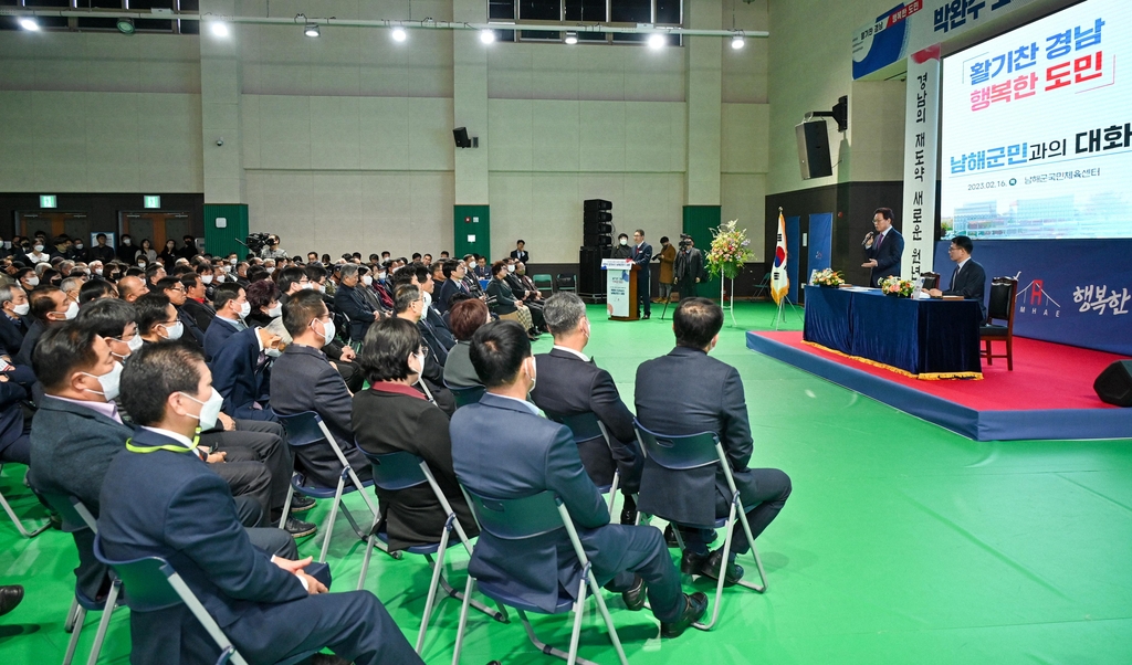 남해군은 이날 도민과의 대화에서 남해∼여수 해저터널 개통에 대비한 발전전략 수립과 지중해풍 해안경관 관광거점 조성 등 군의 주요 현안을 설명하고, 남해군 농어촌 맑은 물 공급과 앵강만 수국테마관광지 조성에 도의 적극적인 지원을 건의했다.
