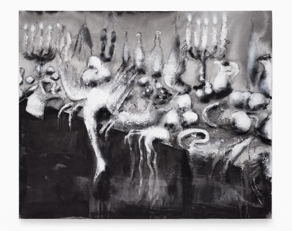 이번 전시는 중세 화가들이 사용한 '그리자유'(grisaille) 기법에서 영향을 받은 '연회' 연작을 선보인다. 그리자유는 단색조 색을 이용해 그 명암과 농담으로 그림을 그리는 화법으로, 바르셀로는 단색조 위에 반투명 색조를 얇게 더하는 방식으로 전통에 자신의 색깔을 입혔다.
