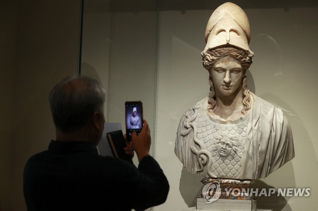 | ▲ 아름다운 아테나 조각상 (서울=연합뉴스) 진연수 기자 = 14일 서울 용산구 국립중앙박물관 상설전시관에 신설된 고대 그리스·로마실에서 열린 '그리스가 로마에게, 로마가 그리스에게' 전시 언론공개회에서 참석자가 아테나(미네르바) 상을 살펴보고 있다. 이번 전시는 오스트리아 빈미술사박물관과 공동 기획으로 가이우스 율리우스 카이사르의 초상 등 126점을 선보인다. 2023.6.14 jin90@yna.co.kr |