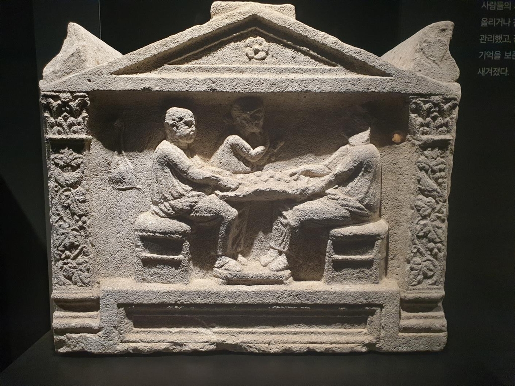 | ▲ '보드게임의 고수, 편히 잠드소서' (서울=연합뉴스) 황희경 기자 = 국립중앙박물관 상설전시관에 신설된 고대 그리스·로마실에 전시된 석회암 유골함 '보드게임의 고수, 편히 잠드소서'. 보드게임을 하는 망자의 모습이 조각돼 있다. 2023.6.14. zitrone@yna.co.kr |