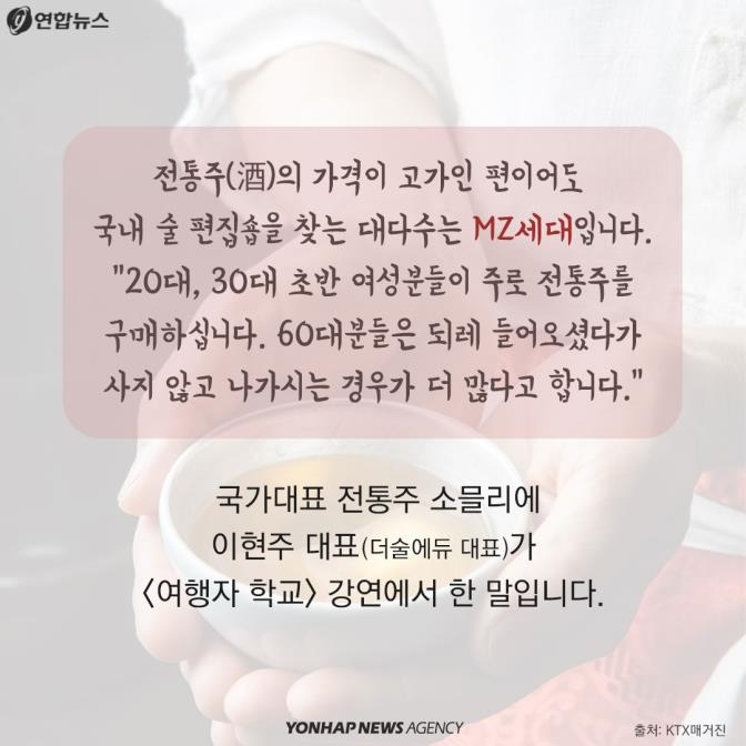 전통주 소믈리에 이현주 더술에듀 대표가 '여행자 학교' 강연에서 한 말입니다. 전통주의 가격이 고가인 편이어도 국내 술 편집숍을 찾는 대다수는 MZ세대입니다.