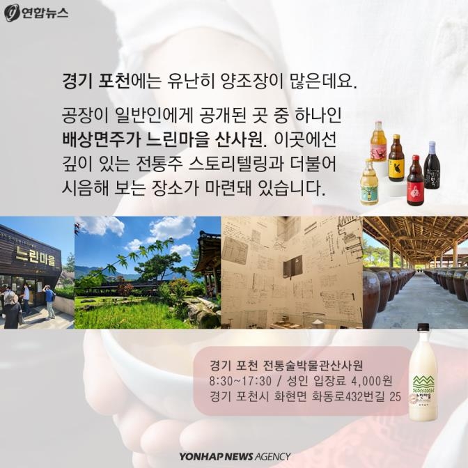 경기도 포천에도 유난히 양조장이 많습니다. 공장이 일반인에게 공개된 곳 중 하나인 배상면주가의 느린마을 산사원이 있습니다. 이곳에는 깊이 있는 전통주 관련 스토리텔링을 볼 수 있고 전통주를 시음해 보는 장소도 있습니다.