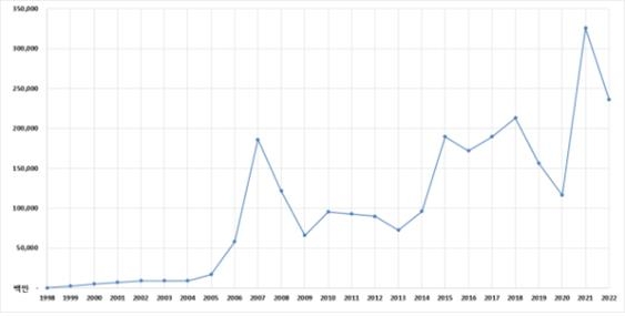 | ▲ 1998~2022 연도별 낙찰총액 변동추이 그래프 [사단법인 한국미술시가감정협회 제공. 재판매 및 DB 금지] |