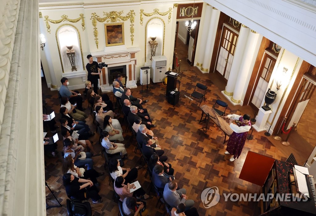 | ▲ 석조전에 울려 퍼지는 연주 (서울=연합뉴스) 이지은 기자 = 대한제국 외교 공간으로 쓰였던 덕수궁 돈덕전(惇德殿)이 9월 정식 개관을 앞두고 12개 국가에 먼저 소개됐다. 26일 오후 서울 중구 덕수궁 석조전에서 프랑소와 봉땅 벨기에 대사, 미하엘 라이펜슈툴 주한 독일 대사, 볼프강 앙거홀처 오스트리아 대사 및 외교 관계자들과 12개 국가 출신의 인플루언서들이 돈덕전 소개 행사에 참석해 축하 공연을 보고 있다. 2023.6.26 jieunlee@yna.co.kr |