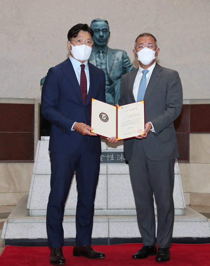 Chung Eui-sun (R), chairman of the Hyundai Automotive Group, poses for a photo with Kim Jae-ho, head of the Korea University Foundation, at the university in Seoul on Aug. 31, 2021, after donating 10 billion won (US$8.6 million), in lieu of his father, the group's Honorary Chairman Chung Mong-koo, to a vaccine development center run by the school to help fight the new coronavirus pandemic. (Yonhap)