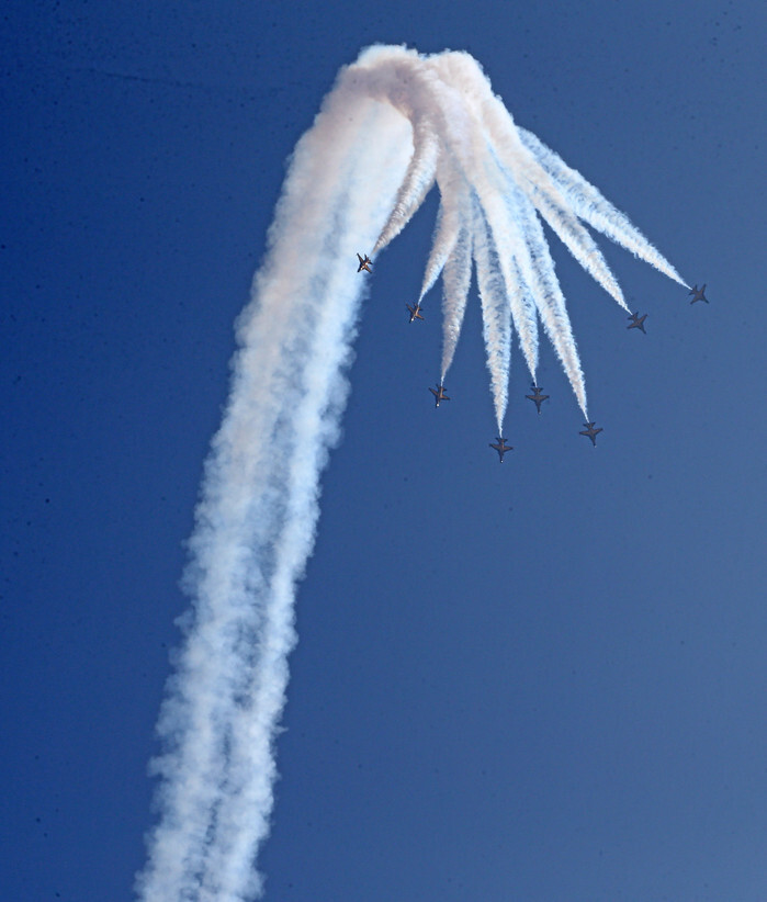 The South Korean Air Force's aerobatic flight team, the Black Eagles, performs over the city of Pohang, North Gyeongsang Province, southeastern South Korea, on Nov. 19, 2021, ahead of its international fireworks festival set for Nov. 20-21. (Yonhap)