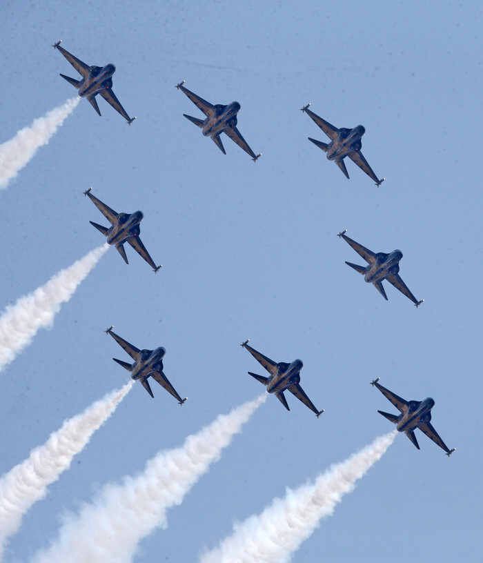 The South Korean Air Force's aerobatic flight team, the Black Eagles, performs over the city of Pohang, North Gyeongsang Province, southeastern South Korea, on Nov. 19, 2021, ahead of its international fireworks festival set for Nov. 20-21. (Yonhap)