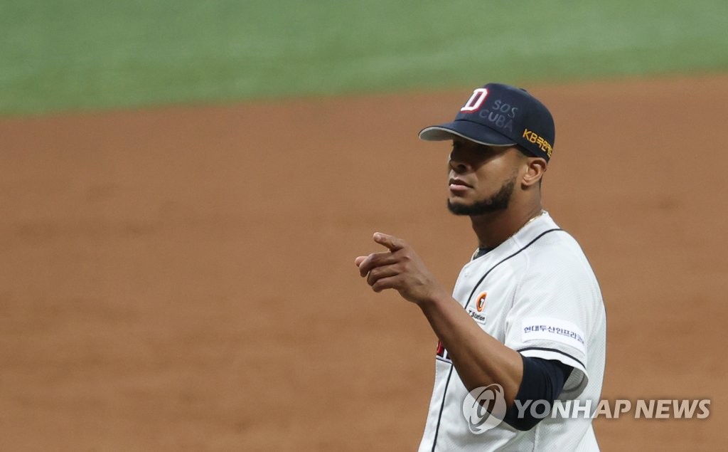 | ▲ In this file photo from Nov. 17, 2021, Ariel Miranda of the Doosan Bears celebrates after retiring the side in the top of the third inning against the KT Wiz in Game 1 of the Korean Series at Gocheok Sky Dome in Seoul. (Yonhap) |