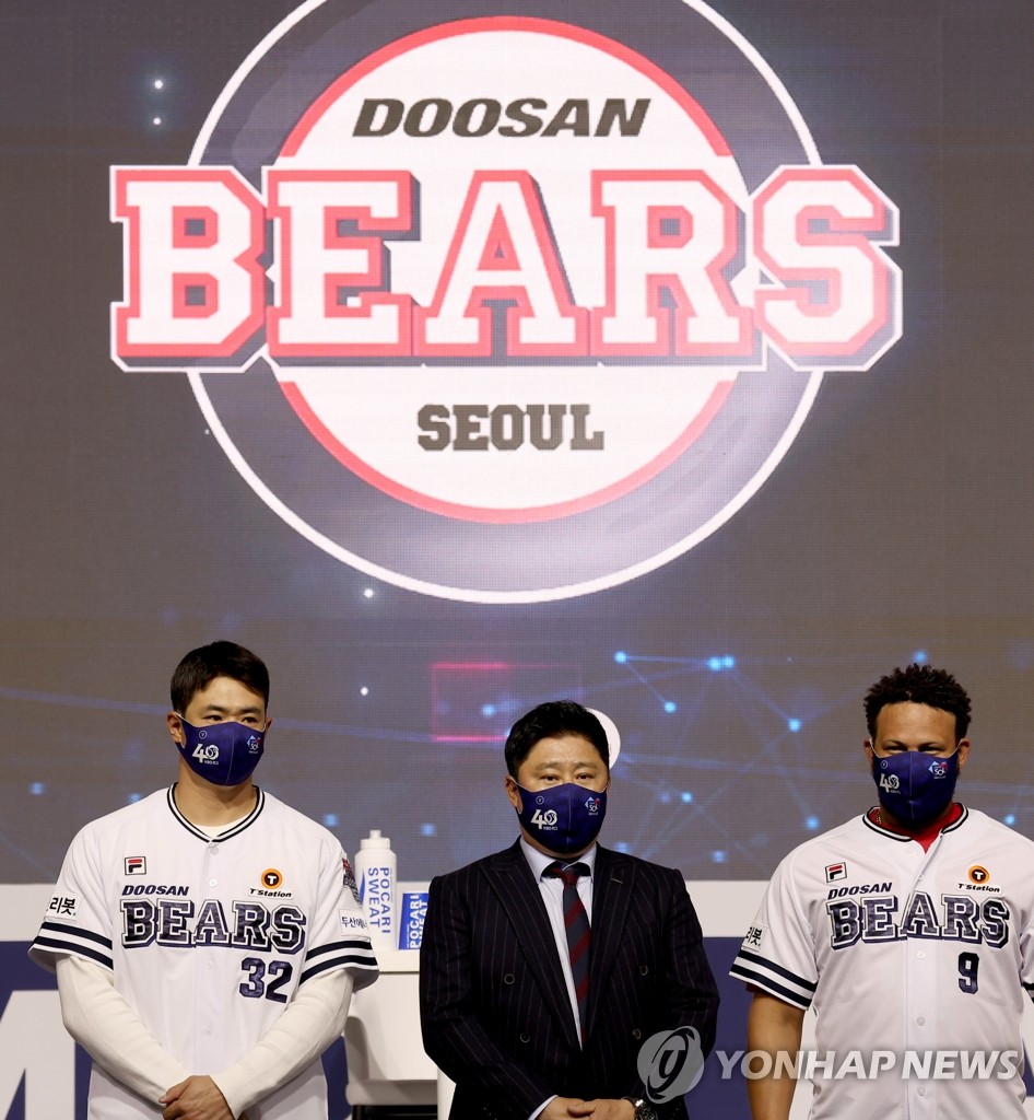 | ▲ From left: Doosan Bears' outfielder Kim Jae-hwan, manager Kim Tae-hyoung and designated hitter Jose Miguel Fernandez pose for a group photo during the Korea Baseball Organization media day at Grand Hyatt Seoul in Seoul on March 31, 2022. (Yonhap) |