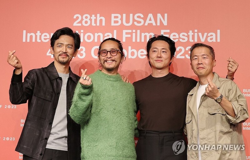 | ▲ Actor John Cho, director Justin Chon, actor Steven Yeun and director Lee Isaac Chung (from L to R) pose for a photo after a press conference on a special program focusing on Korean diasporic cinema, a sideline event for the Busan International Film Festival, held on Oct. 6, 2023, in the southeastern port city of Busan. (Yonhap) |