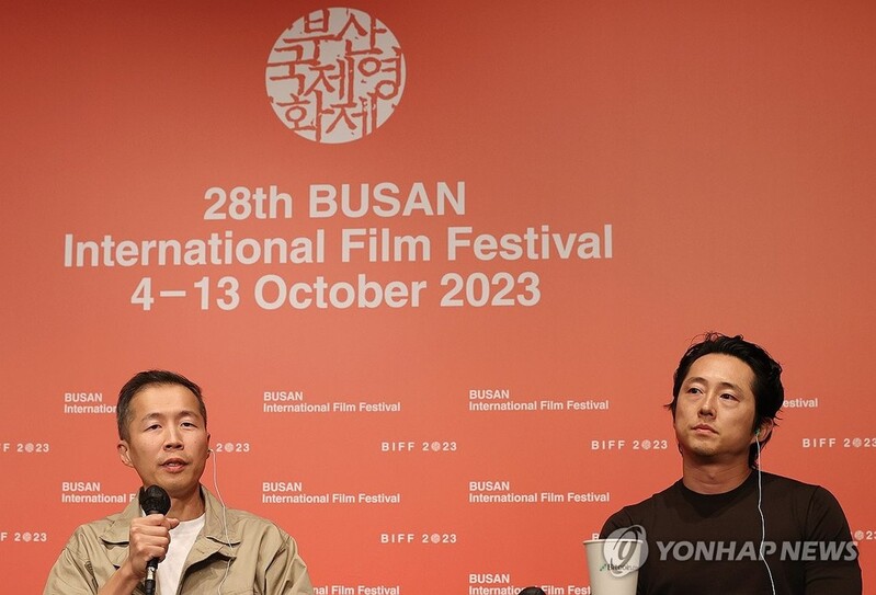 | ▲ Lee Isaac Chung (L), director of Golden Globe-winning film "Minari," and its lead actor, Steven Yeun, speak during a press conference at the Busan International Film Festival in the southeastern port city of Busan on Oct. 6, 2023. (Yonhap) |