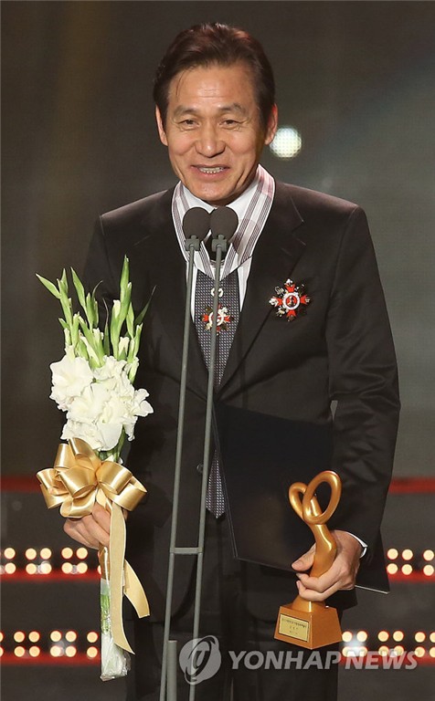 | ▲ In this file photo, Ahn Sung-ki makes an acceptance speech as he is awarded the Eungwan (Silver) Order of Cultural Merit, the second-highest class of the country's cultural decoration, on Nov. 18, 2013. (Yonhap) |