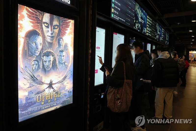 | ▲ Moviegoers purchase tickets at a multiplex cinema in Seoul on Dec. 28, 2025, with a poster for Disney's "Avatar: Fire And Ash" displayed on a screen. (Yonhap) |