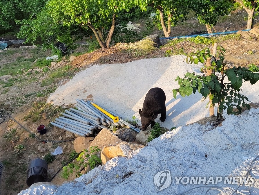 | ▲ An Asiatic black bear, classified worldwide as a first-grade endangered animal, prowls around a house in Gwangyang, South Jeolla Province, southwestern South Korea, on May 13, 2021, in this photo released by the Gwangyang municipality. The bear disappeared after attacking the house's chicken coop. [Yonhapnews DB] |
