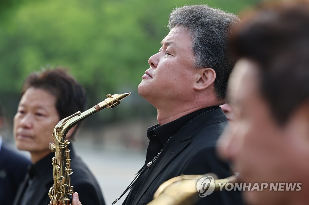 | ▲ 전국노래자랑 악단, 고인을 떠나보내며 (서울=연합뉴스) 홍해인 기자 = 전국노래자랑 악단 단원들이 10일 오전 서울 영등포구 KBS 본관 앞에서 열린 '국민 MC' 방송인 고(故) 송해 추모 노제에서 운구차가 떠난 뒤 연주를 마치며 고인을 회상하고 있다. 2022.6.10 hihong@yna.co.kr |