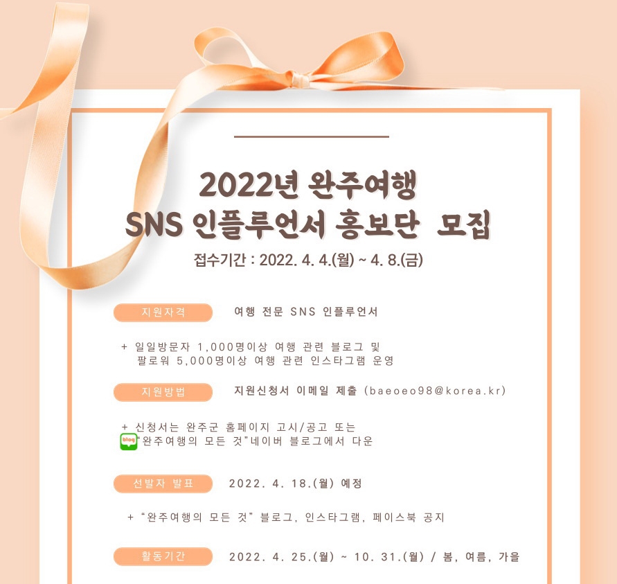 지원 자격은 일일 방문자 1천명 이상의 블로그 운영자, 5천명 이상의 팔로워를 보유한 인스타그램 사용자다.