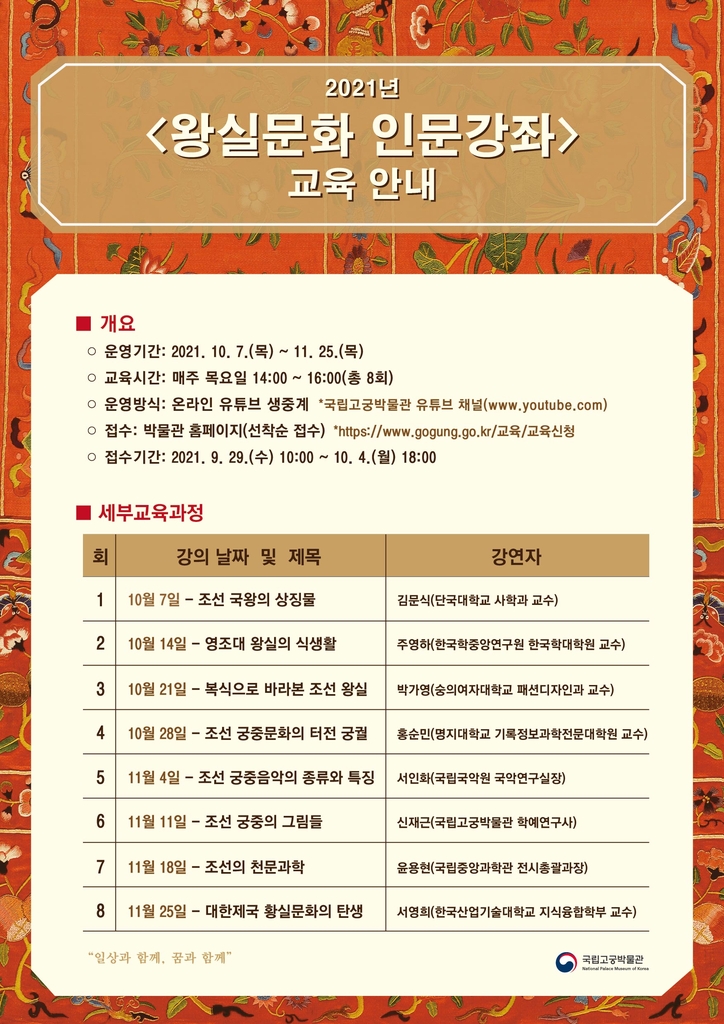 ▲ 국립고궁박물관은 성인 대상 문화 행사인 '왕실문화 인문강좌'를 다음 달 7일부터 11월 25일까지 매주 목요일에 진행한다.