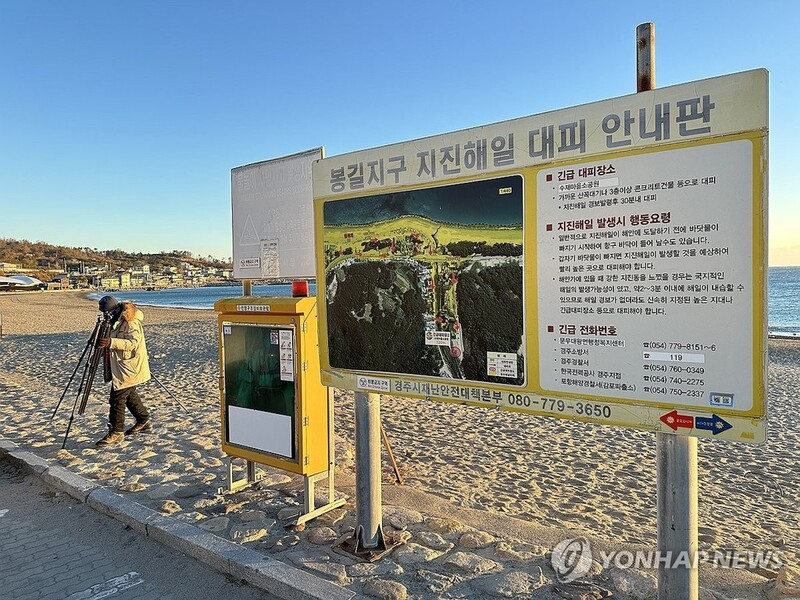 | ▲ 경주 문무대왕면 지진해일 대피 안내판 (경주=연합뉴스) 윤관식 기자 = 30일 오전 경북 경주시 문무대왕면 입천리에서 규모 4.0 지진이 발생한 가운데 봉길대왕암해변 문무대왕릉 앞에서 한 출사자가 지진해일 대피 안내판을 지나가고 있다. 2023.11.30 psik@yna.co.kr |