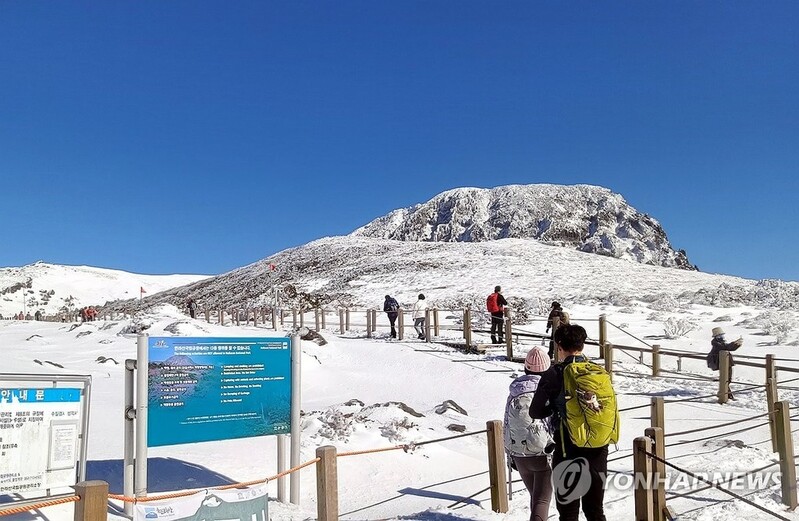 지난 16∼18일 대설특보가 발효될 정도로 많은 눈이 내려 겨울왕국으로 변한 한라산에는 이날 많은 탐방객이 올라 파란 하늘 아래 펼쳐진 눈부신 설경을 감상했다.