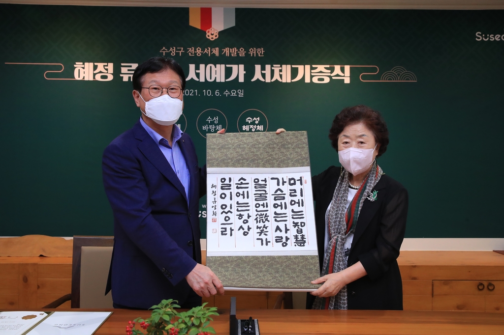 | ▲ 수성구 전용 서체 (대구=연합뉴스) 류영희(오른쪽) 서예가가 6일 대구 수성구청을 방문해 '수성혜정체'로 쓴 서예 작품을 전달하고 있다. 2021.10.6 [수성구 제공. 재판매 및 DB 금지] |