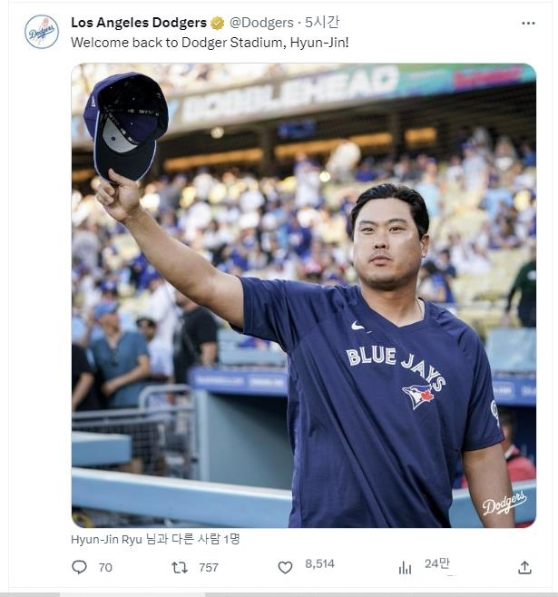 미국프로야구 메이저리그(MLB) 토론토 블루제이스 구단은 26일(한국시간) 소셜미디어를 통해 로스앤젤레스 다저스 선수단을 만난 류현진의 모습을 소개했다.