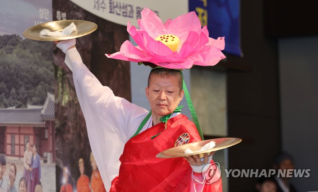(서울=연합뉴스) 김예나 기자 = 구성진 태평소 소리가 시작을 알리자 하얀 장삼 위로 붉은 천을 드리운 주인공이 등장했다. 한 걸음, 또 한 걸음.