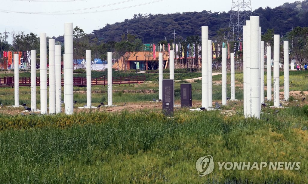 | ▲ 정읍 동학농민혁명기념공원 내 '울림의 기둥' (정읍=연합뉴스) 최영수 기자 = 11일 개원한 전북 정읍시 덕천면 동학농민혁명공원 내 '울림의 기둥'. 이 기둥은 전국 90개 지역에서 일어난 동학온민혁명군을 상징한다. 2022.5.11 kan@yna.co.kr |