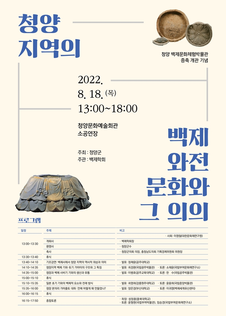 이번 학술대회는 백제가 공주에 도읍을 둔 웅진도읍기(475∼538)와 부여로 천도한 사비도읍기(538∼660)를 전후해 청양 지역에서 와전(瓦塼·기와와 벽돌) 문화가 어떻게 형성됐는지, 역사적·학술적 가치는 어떤지 등을 조명한다.