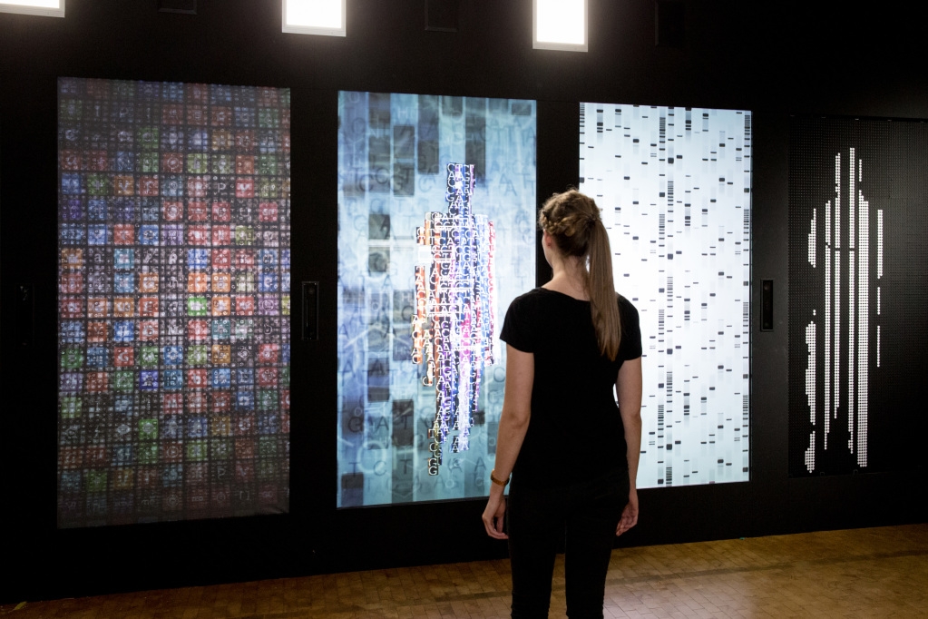 또 다른 인터랙티브 작품 'YOU:R:CODE'는 스크린 앞에 선 관객의 신체를 스캔해 키와 나이, 머리 색깔, 마스크 착용 유무 등을 바로 분석하고 바코드로도 표현해 보여준다. 이 작품은 제목을 '당신의 코드'(Your code)나 '당신은 코드다'(You are code) 중 어떻게 읽느냐에 따라 '우리는 코드로 구성돼 있다'거나 '다양한 디지털 코드로 변환될 수 있다'는 다른 메시지로 해석할 수 있다.