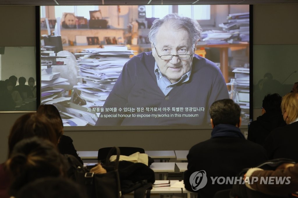 | ▲ 페터 바이벨 작가, 영상으로 인사 (서울=연합뉴스) 강민지 기자 = 2일 오전 서울 종로구 국립현대미술관 서울관에서 열린 '페터 바이벨: 인지 행위로서의 예술' 전시 간담회에서 작가의 영상이 상영되고 있다. 2023.2.2 mjkang@yna.co.kr |