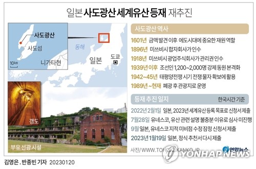 (도쿄·서울=연합뉴스) 김호준 특파원 김효정 기자 = 일본 정부가 일제강점기 조선인 강제노역 현장인 니가타현 사도광산을 세계문화유산으로 등재하기 위한 정식 추천서를 유네스코에 다시 제출했다고 교도통신과 NHK가 20일 보도했다.
