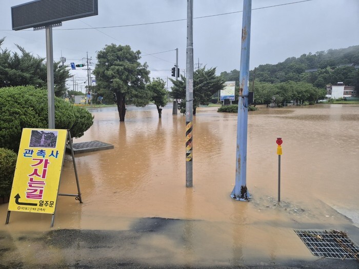 A road in the central city of Nonsan is submerged in water after heavy rainfall on July 8, 2024, in this photo provided by the Chungnam Fire Service Headquarter. (PHOTO NOT FOR SALE) (Yonhap)