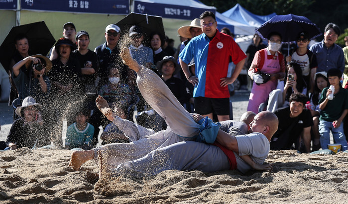 Buddhist monks take part in a "ssireum" competition at a temple in Daegu, about 230 kilometers southeast of Seoul, on Oct. 11, 2025. Ssireum is a form of traditional Korean wrestling. (Yonhap)