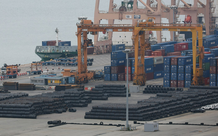 Steel products are piled up at Pyeongtaek Port, about 60 kilometers south of Seoul, on Oct. 12, 2025, after the European Union announced its proposal to sharply reduce tariff-free steel import quotas and increase duties on out-of-quota shipments. (Yonhap)