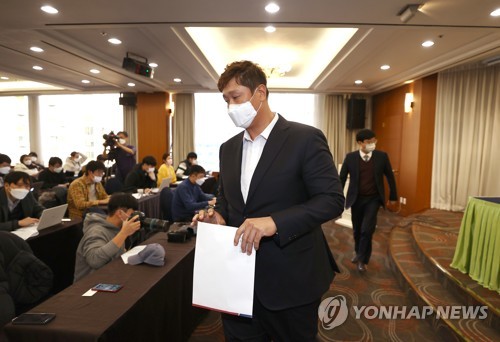 | ▲ 이대호, 판공비 관련 논란 해명 (서울=연합뉴스) 신준희 기자 = 판공비 인상 문제로 비판을 받는 한국프로야구선수협회 회장 이대호(롯데 자이언츠)가 2일 강남구 리베라호텔에서 기자회견을 열고 관련 논란에 대해 해명한 뒤 자리를 나서고 있다. 2020.12.2 hama@yna.co.kr |