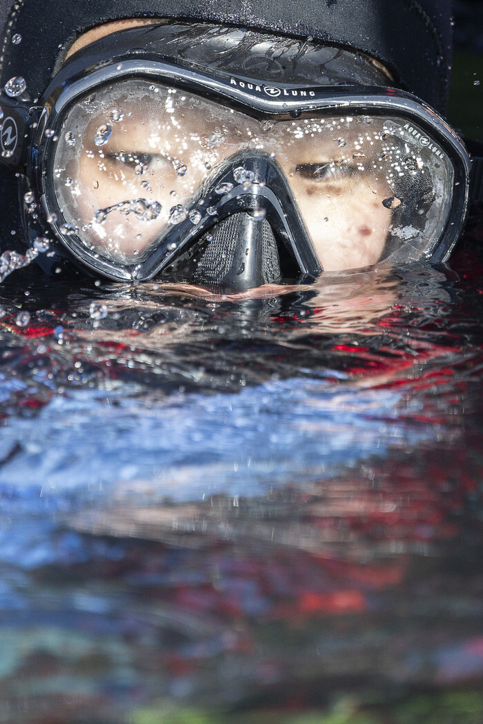 A rescuer dives into a hole on a frozen reservoir in a drill that simulates a drowning incident in Yangju, near Seoul, on Feb. 4, 2025. (Yonhap)
