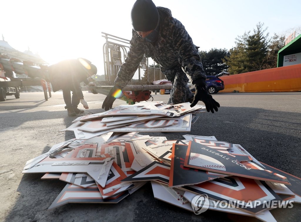 | ▲ Workers pile up discarded signs for the SK Wyverns baseball club at SK Happy Dream Park in Incheon, 40 kilometers west of Seoul, on Feb. 23, 2021. (Yonhap) |