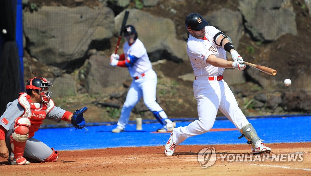 | ▲ Jamie Romak of the SK Wyverns (R) fouls off a pitch in an intrasquad game at Kang Chang-hak Baseball Stadium in Seogwipo, Jeju Island, on March 5, 2021. It was the final scrimmage prior to the Wyverns' name change under the new ownership by Shinsegae Group. (Yonhap) |