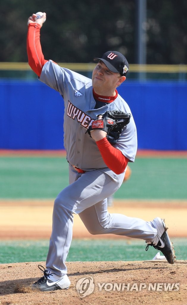 | ▲ Artie Lewicki of the SK Wyverns throws a pitch in an intrasquad game at Kang Chang-hak Baseball Stadium in Seogwipo, Jeju Island, on March 5, 2021. It was the final scrimmage prior to the Wyverns' name change under the new ownership by Shinsegae Group. (Yonhap) |