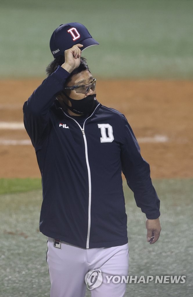 | ▲ Doosan Bears' manager Kim Tae-hyoung acknowledges fans after beating the LG Twins 5-1 in Game 1 of the first round in the Korea Baseball Organization postseason at Jamsil Baseball Stadium in Seoul on Nov. 4, 2021. (Yonhap) |