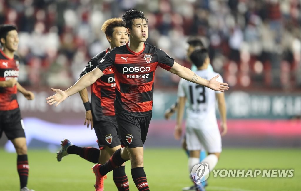 | ▲ In this file photo from May 30, 2021, Song Min-kyu of Pohang Steelers (C) celebrates his goal against Gwangju FC during a K League 1 match at Pohang Steel Yard in Pohang, 370 kilometers southeast of Seoul. (Yonhap) |
