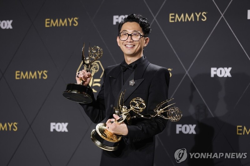 | ▲ 에미상 작품상, 감독상, 작가상 3개 트로피 받아든 이성진 감독 [EPA=연합뉴스. 재판매 및 DB 금지] |