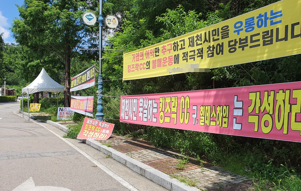 | ▲ 골프장 입구에 내걸린 플래카드 [박재천 촬영] |