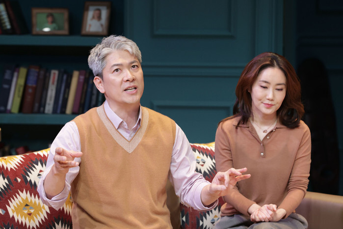South Korean actor Kim Sang-kyung (L) and actress Jung Yeon, who star in the musical "Carnage," perform during a publicity event in Seoul on Dec. 10, 2024. The musical runs from Dec. 3 to Jan. 5. (Yonhap)